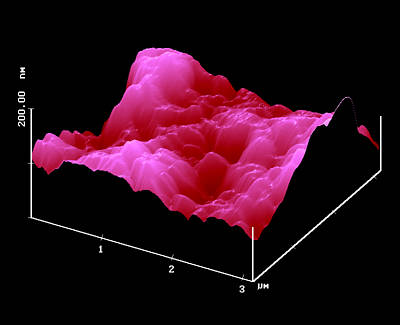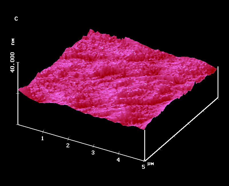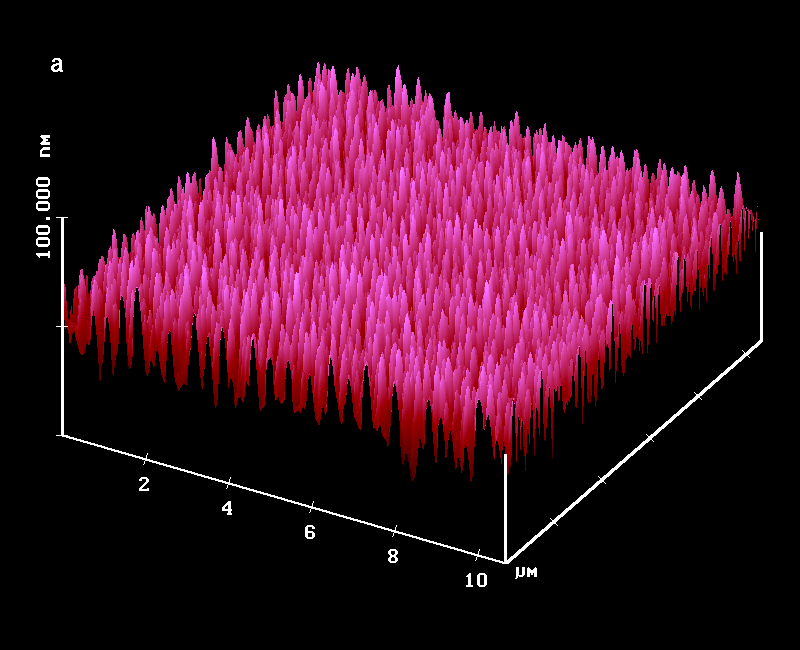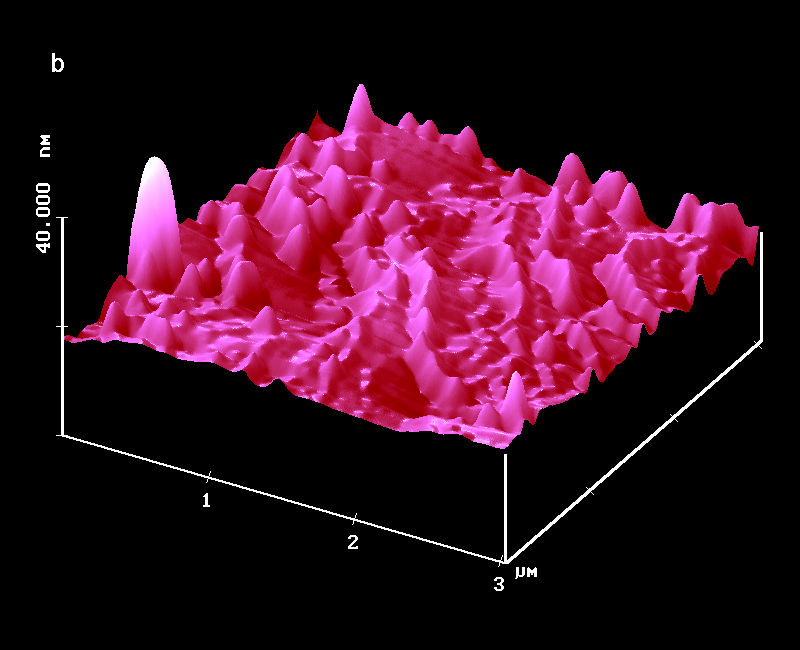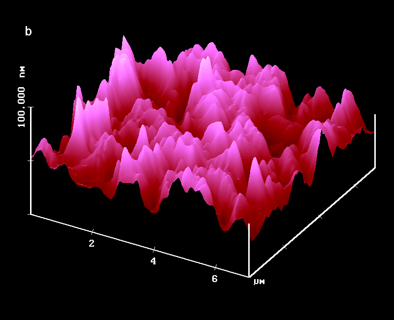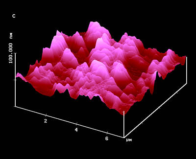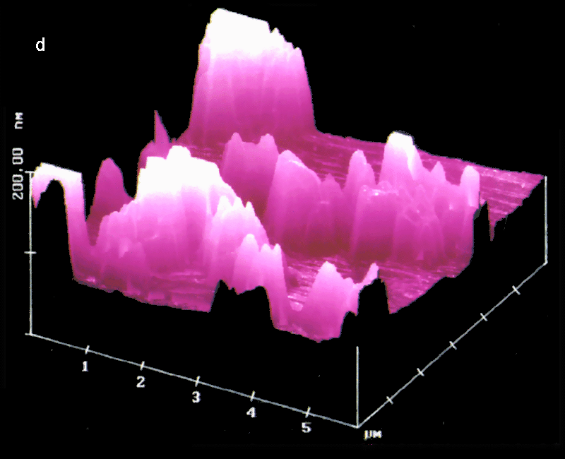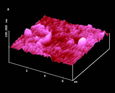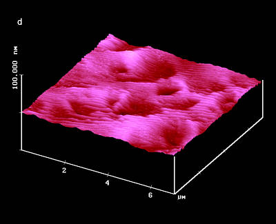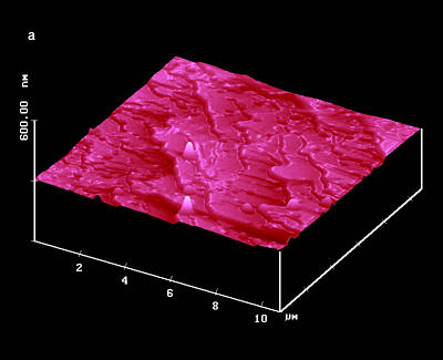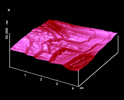 An optical near-field microscope SNOM is more complex than an AFM. 8 different basic techniques exist [5]. Only one of these is able to scan rough and transparent or opaque surfaces by chosing light fibers that are pulled to extremely fine tips. Radii down to 15 nm are used for best resolution and the tips are not coated with metals. That option has to be chosen for organic surfaces. Figure 3b,c shows that flat-end metal-coated tips with typical apertures of 100 nm are unsuitable because they cannot follow submicroscopic roughness in constant distance of <=10 nm. The only suitable option are slim uncoated tips that do not heat up [5,6]. Tips that are coated with aluminium (m.p. 660°C) and have very small apertures (e.g. 20 nm) loose the metal at their ends when light is fed in and become far-field apertured tips with much larger apertures (e.g. 400 nm) for special use [6]. Unfortunately metal-coated fiber tips with normal apertures of ·50 nm develop temperatures of 100 - 500°C (up to their destruction) even in ambient atmosphere, while being at 5 - 10 nm distance to the surface [5,6] which is totally unsuitable as well. A setup similar to Figure 3 with uncoated tips was initially developed and used by Courjon [7] and can now be purchased from DME in Copenhagen or from FHR in Dresden. The laserbeam is coupled into the fiber, it hits to the surface that is in the near-field at 5 - 10 nm from the tip end, and is particularly efficiently reflected back into the fiber only in that near-field. Coming back unpolarized it is coupled out at the beam splitter and activates the photodetector point by point. The distance control is acheived by non-contact AFM. The z-piezo uses the damping of the amplitude of the horizontally vibrating tip if it is approached to the surface. Such damping is detected by a red emitting diode laser and transformed in a feedback signal for the z-piezo keeping the distance constant and at the same time creating a topographic non-contact AFM image. While the reasons for the distance depending damping are still not fully understood it is generally, though incorrectly, called "shear-force". The resolution of the reproducible images that are undisturbed from thermal effects (absorbing samples are scanned rapidly) is routinely better than 20 nm [5]. More specialized techniques reach even better resolutions. These are required if, for example, single base pairs of nucleic acids are to be resolved and identified. Clearly, such endeavour will only be successful with cold and slim tips.