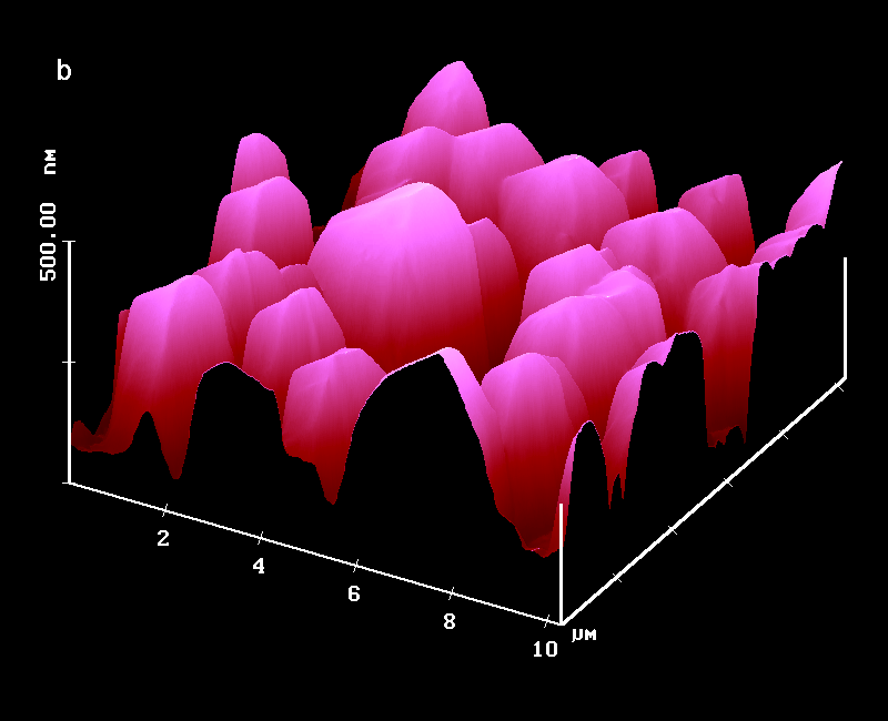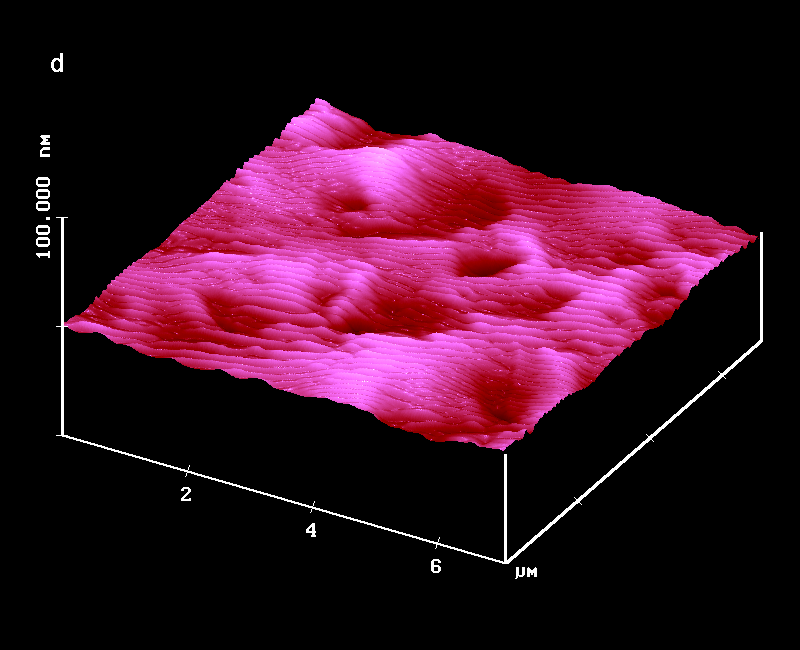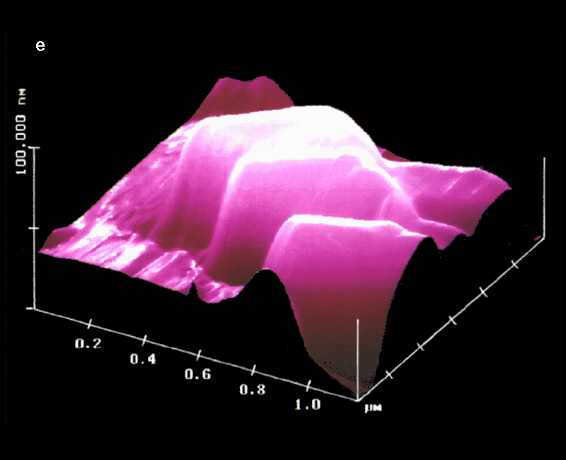Figures 7c,d show the situation on the (110)-face of 1. Half of the molecules are 23° skew, the other half 76° steep on the long edge [4,5]. Therefore, pressure that has built up inside the crystal by the photodimerisation can only be released here by vertical molecular movements above the crystal surface. During the phase rebuilding stage small volcanoes form everywhere (Fig. 7d). These grow upon further irradiation. Thus, the packing of the molecules determines the shape of the surface features and these are definitely different on different crystallographic faces.