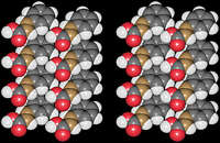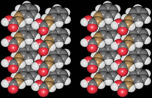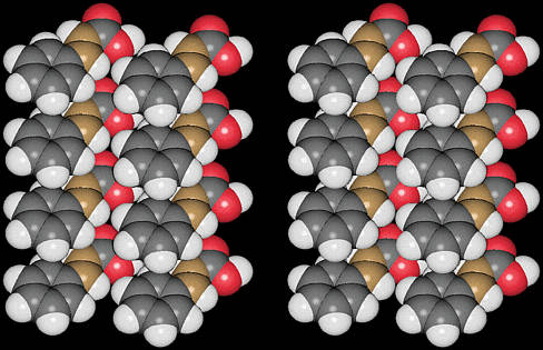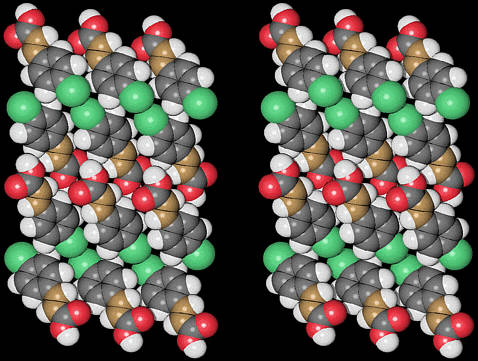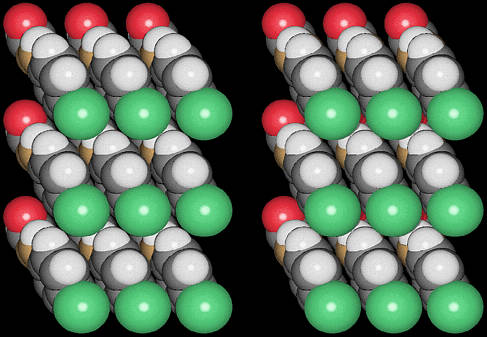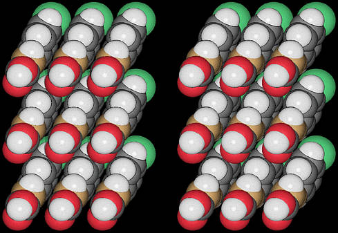 Fig. 15. Space filling stereoscopic packing diagrams of the structure model ß-p-chloro cinnamic acid (P21/a) on (010); the double bonds are freely available on that surface.
