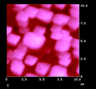 1) Newly formed molecules have to arrange with the basic lattice around them in the initial stage of the transformation. Molecules move along crystallographically easy paths and thus form characteristic face-specific features by phase rebuilding.2) If the concentration of product molecules increases, a point will be reached where the distorted initial lattice cannot be kept any more. The product lattice forms suddenly usually with very large changes of the surface topography by (local) phase transformation.