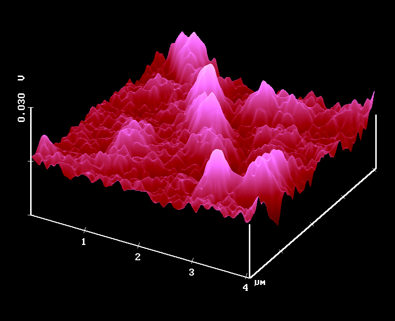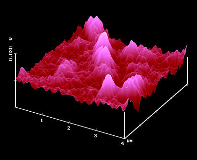 The construction of an atomic force microscope (AFM) is surprisingly simple. It differs from a tunneling microscope (STM) by scanning mostly van der Waals forces instead of tunneling currents. Both techniques succeed in ambient atmosphere or in ultra high vacuum UHV, at room temperature or at very low temperatures (77 K or 4 K). Figure 1 shows the blueprint of an AFM for ambient conditions in the most frequent version. The sample is fixed to an x/y/z-piezo which moves it in the 3 directions in space by application of suitable voltages. An atomic tip (usually out of Si or Si3N4) is approached to the sample under computer control until the van der Waals attractive forces assume values in the range of 10-7 to 10-9 N. Only the lateral atomic resolution requires still further approach such that repulsive forces come to work. The tip is part of a miniscule cantilever spring (Si or Si3N4) which is coated with gold on its backside. A focussed laser beam hits the backside of the tip and is reflected to a mirror and from there to a split photodiode. If a change in height occurs during the scan in x (usually 512 points) and y (usually 512 lines) the balance of the splid diode is lost and reinstalled by actuation of the z-piezo which receives its voltage from the split photodiode. Thus, the distance (the force) stays constant during the whole scan. Furthermore, the voltage that actuates the z-piezo is transformed poit by point to the AFM image with submicroscopic resolution with the aid of a computer and imaging software.