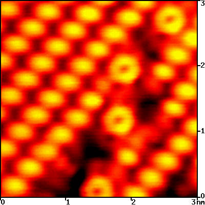 Fig. 4. Highly resolved STM-surface of graphite at constant tunnel current, measured with a tungsten tip at a RASTERSCOPE 3000. We thank DME, Copenhagen, for the raw data of that image.