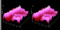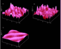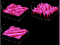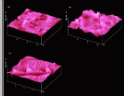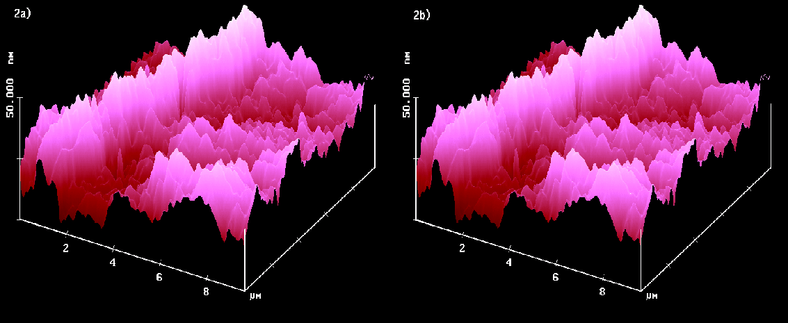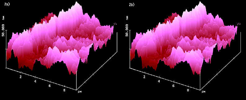 This technique is very sensitive especially in Z-direction. Also the XY-area can be diminished so strongly by the piezo drive, that as in the case of STM individual atoms may be resolved. For more mobile organic and biological materials at present the limit is more at the molecular resolution. This epoch-making goal which has been reached in several instances without doubt [4] is by far not the whole story. Rather there is a high need for representations of 10 to 15000 nm width and even larger (e.g. with data supports, ceramics, foils). This is also particularly valid for chemically reacting surfaces. Contrary to light microscopy there are no problems with depth of focus. One obtains always 3D-images with enormous richness in details, which may be measured precisely in terms of heights (up to 5µ), distances, angles. Standard tips with the vertex angles of 45° can at most measure slopes up to this angle (1:1-images) (at steeper slopes one observes characteristic tip-artifacts which may be avoided with needle type special tips or tapping and non-contact mode measurements), however, steeper objects are rare on organic surfaces.