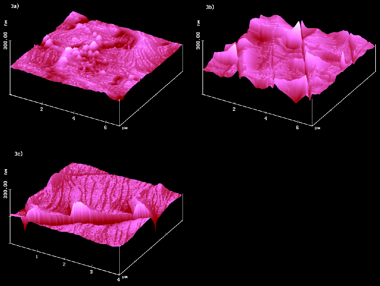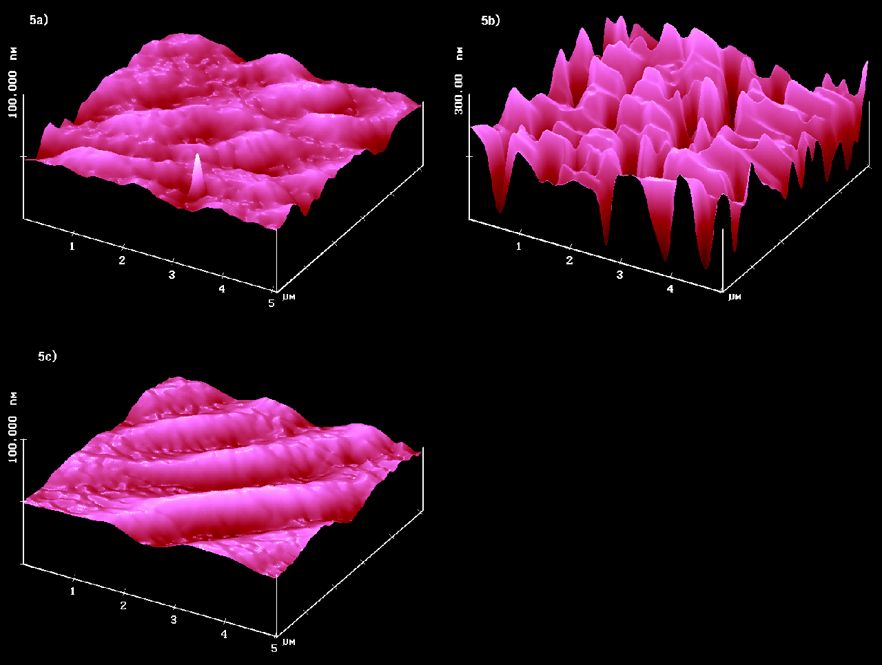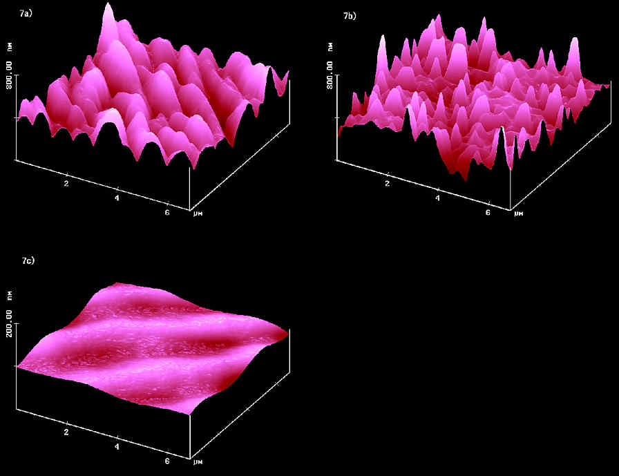 Again there are enormous well directed material transports at the surface in the region down the light penetration depth. Interestingly, the craters disappear completely upon continuation of the irradiation and there is formation of a weakly currugated but again very flat surface (Fig. 5c). All of that could not be expected on the basis of the topochemical postulate and its refinements and auxiliary hypotheses. This must be understood in detail.