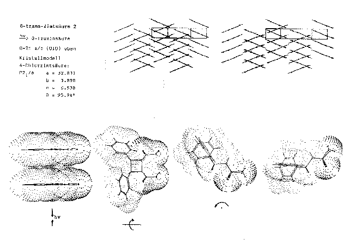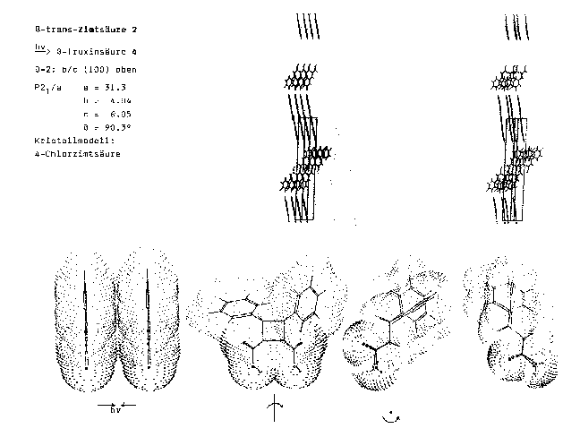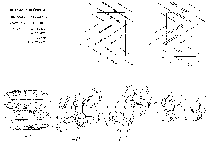 It is now possible to interpret on a molecular basis if we compare the molecular packing of alpha-2 and the molecular shapes of 2 and 3.which are semiempirically (PM3) calculated with high reliability.Figure 4 shows that the monomers in alpha- 2 cut the (010)-face under the flat angle of 30°. There is an accordion-like structure. The dimer 3 which is formed all over after light absorption can fit into the basic lattice if it turns in the ways indicated by the arrows.